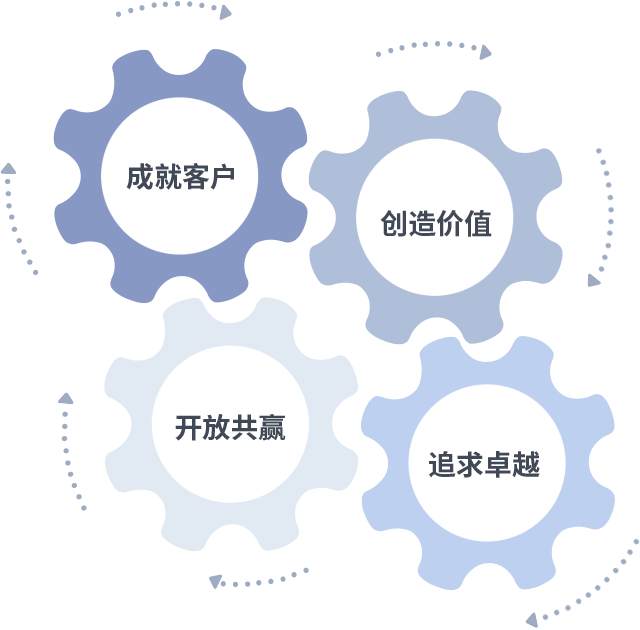 成就客户是一切决策的出发点,,创造价值是衡量所有工作的标准,,追求卓越是我们做事做人的态度,,,,开放共赢是我们的格局也是最终的结果。。。。价值观的齿轮环环相扣,,推动着组织里的每个人不断向前。。。